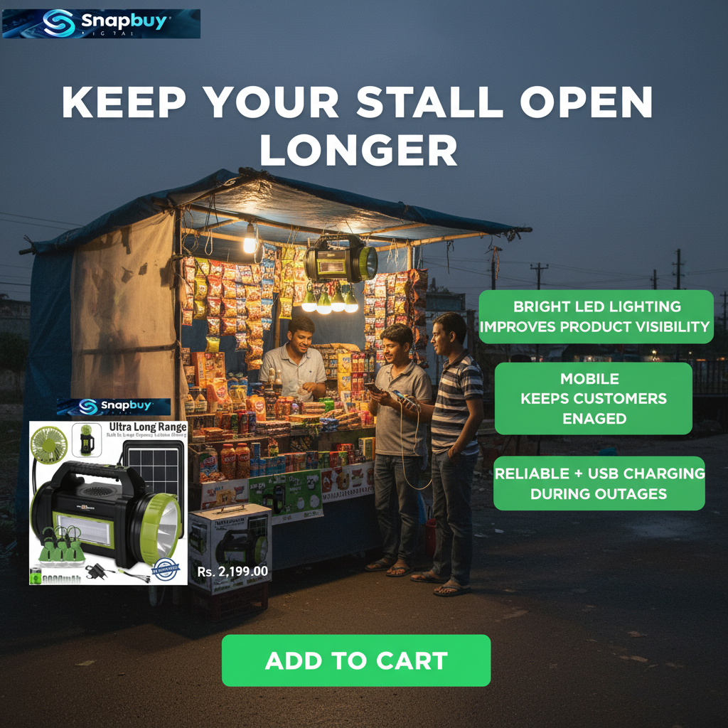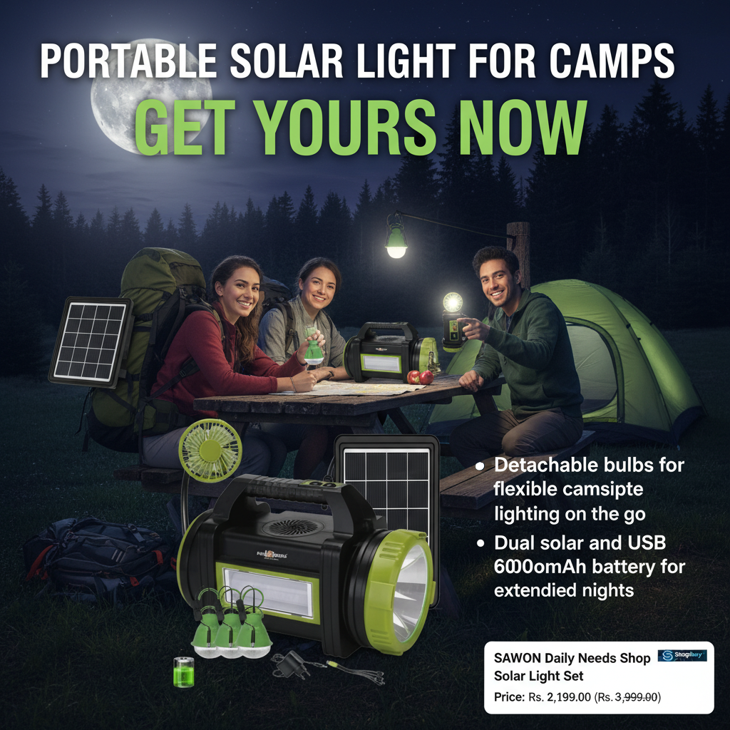 - Stay prepared for any power outage or outdoor adventure with the Daily Needs Shop Portable Solar Inverter Kit Emergency Light—a complete all-in-one solution for lighting, ventilation, and mobile charging. Designed to provide essential power backup in emergencies, rural areas, or while camping, this smart device combines functionality, portability, and energy efficiency into one compact unit.Equipped with a powerful 6000mAh rechargeable battery, this unit offers long-lasting support to power multiple devices simultaneously. It comes with three detachable LED bulbs, each with a long wire and individual switch—perfect for lighting up different areas of your home, tent, or work zone during a blackout. The high-intensity LED torch offers a focused long-range beam for safe movement in the dark, while the built-in electric fan delivers refreshing airflow during hot conditions.This versatile inverter system features dual charging options—via solar panel or USB cable—making it highly dependable even in off-grid locations. It also functions as a mobile powerbank, capable of charging your smartphones and other USB-powered gadgets, ensuring you stay connected even during emergencies.Compact, durable, and easy to carry, the Daily Needs Shop inverter kit is ideal for households, small shops, travelers, field workers, or anyone needing a reliable power backup system. With its multiple utilities and eco-friendly design, it’s the perfect blend of convenience and sustainability.